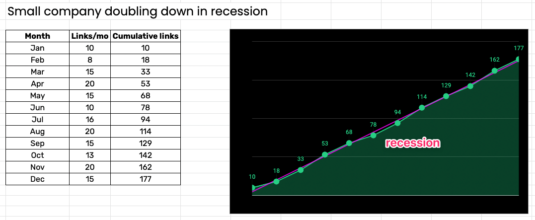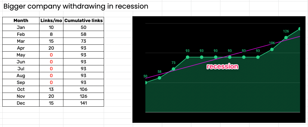 Example: This company starts off ahead with 50 links but stops promoting its content today (recession) and picks back up in October. They built 141 links in 12 months.