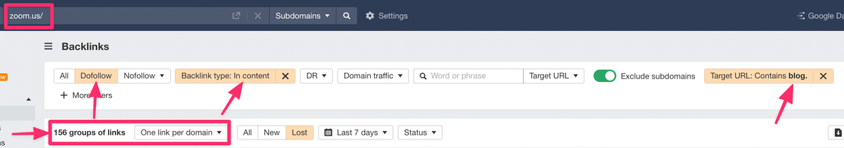 Zoom lost 156 unique dofollow backlinks to the blog in the last 7 days: